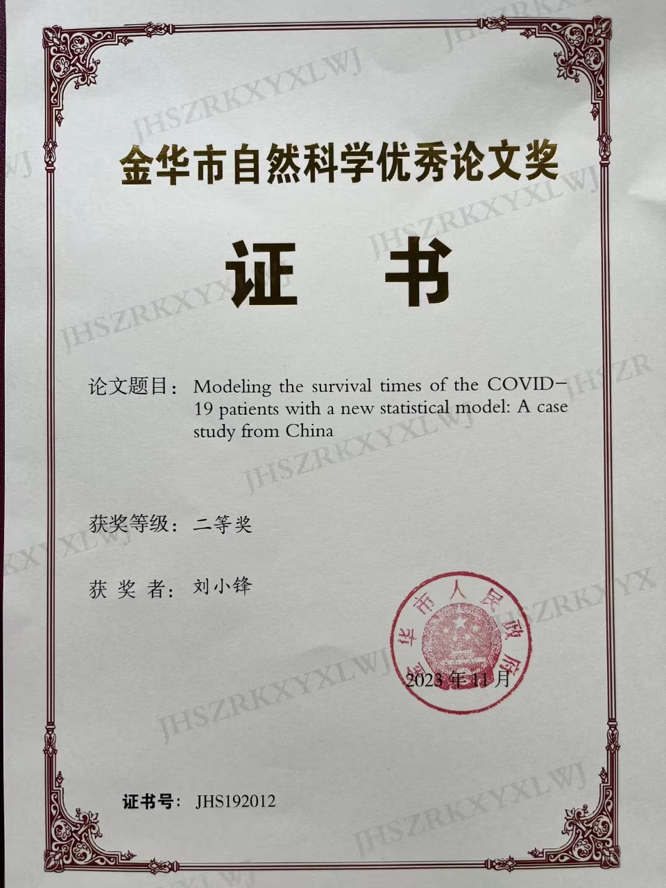近日,金华市自然科学优秀论文奖评审领导小组办公室下发了《关于公布第十九届金华市自然科学优秀论文奖评选结果的的通知》,学院刘小锋老师团队的《Modeling the survival times of the COVID-19 patients with a new statistical model: A case study from China》获优秀论文二等奖。