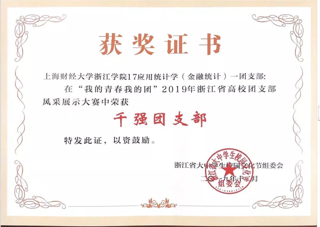 2019年12月,在“我的青春我的团”2019年浙江省高校团支部风采展示大赛中,星空官方端网站17应用统计学(金融统计)一团支部获浙江省“千强团支部”荣誉称号。