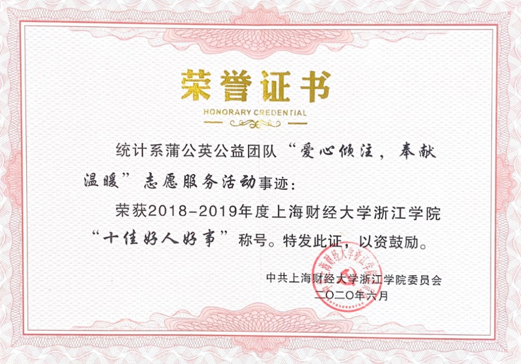 我系蒲公英志愿公益团队荣获学院“十佳好人好事”称号并获得表彰。据悉该团队自2018年10月成立以来,一直秉承“扎根八婺大地,弘扬志愿精神”的宗旨,在阳光助残、城市文明创建、古城文明宣传、公益助跑等志愿活动中,做一些力所能及之事。