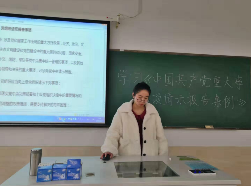 为了认真学习中共中央印发的《中国共产党重大事项请示报告条例》。2019年3月14日中午,统计系党支部在7幢408召开了《中国共产党重大事项请示报告条例》的学习大会。会议由学生党员冯吉枫主持。