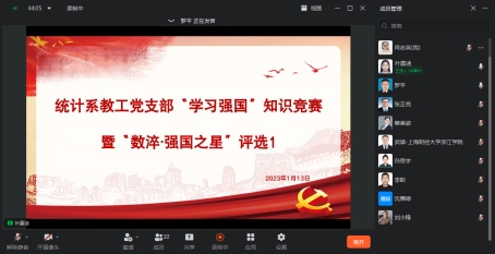 会议第五项,全体党员同志共同参加“以赛促学,奋勇争先”为主题的“学习强国”知识竞赛活动。竞赛过程精彩纷呈、跌宕起伏,经过激烈比拼,最终决出孙思宇同志获得统计系1月份月度“数淬•强国之星”。