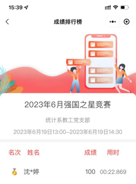 最后,全体党员同志共同参加“以赛促学,奋勇争先”为主题的“学习强国”知识竞赛活动。竞赛过程精彩纷呈、跌宕起伏,经过激烈比拼,最终决出沈雁婷同志获得统计系6月份月度“数淬•强国之星”。